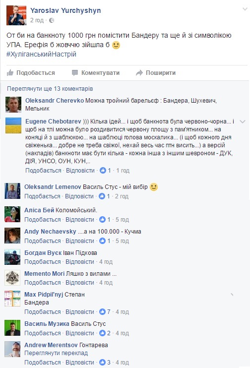 Якою буде новенька «тисячна» гривня, досі невідомо, адже це – ВЕЛИКА «державна таємниця». Але народ наш зорієнтувався швидко. У Фейсбук-спільноти уже знайшлися варіанти: від Бандери, Мельника і Шухевича... до Кучми, Ляшка з вилами і Гонтарєвої на фоні Нацбанку.