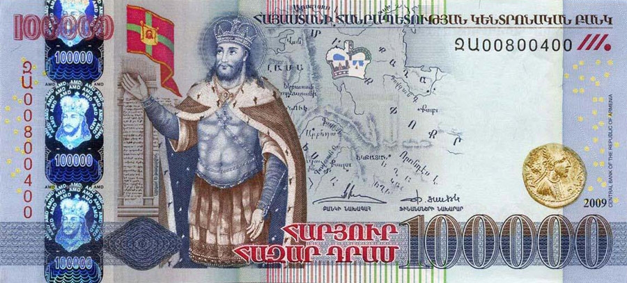 Вірменія: 100 000 драм. На купюрі: цар Абгар V, який, згідно легенді, листувався з.... Ісусом Христом.