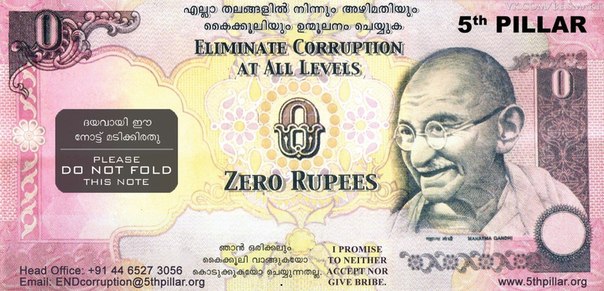У 2010 році індійська організація з боротьби з корупцією випустила символічні банкноти номіналом 0 (нуль) рупій. Антикорупціонери закликали індійців давати чиновникам-здирникам хабарі тільки такими купюрами. Тираж банкнот розійшовся дуже швидко завдяки сповіщенню про це населення серед ЗМІ. Нам зараз такі купюри теж були б дуже доречні!