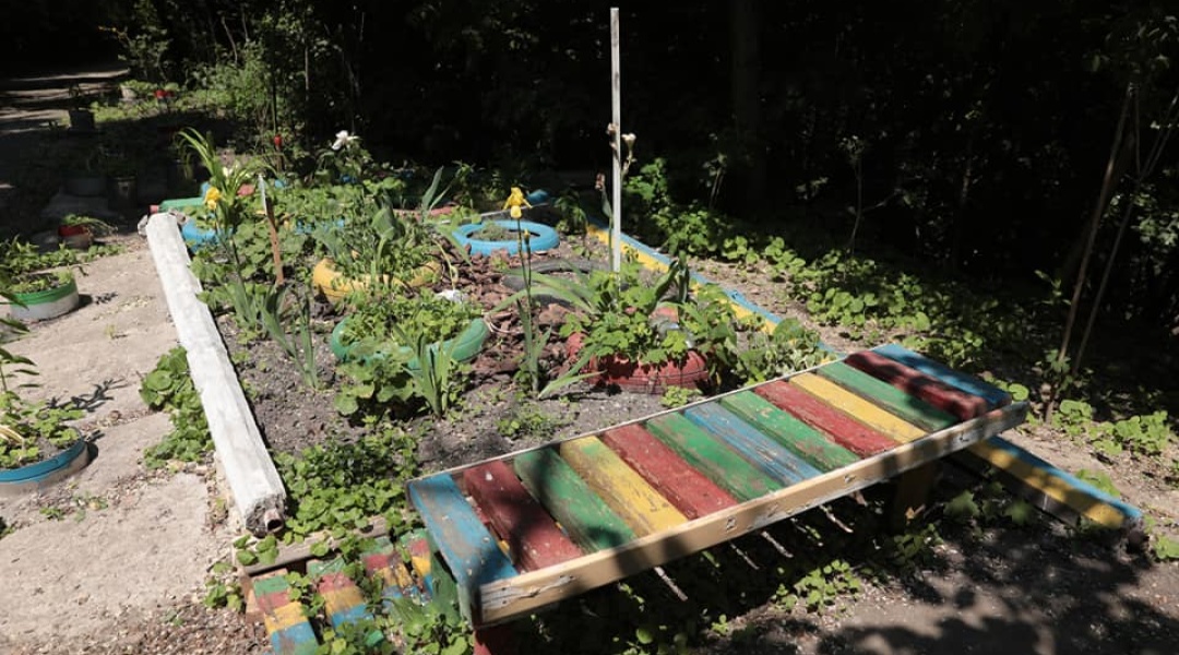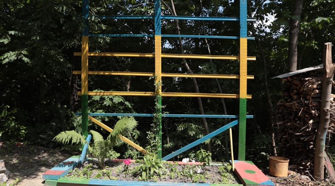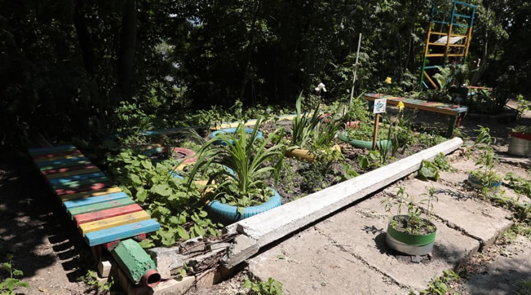 Коли доріжка трішки звертає праворуч, здалеку помічаємо скромний, але яскравий і несподіваний перехожому квітник, який Геннадій Андрійович називає олімпійським через розмаїття відповідних – олімпійських - кольорів - троянди, іриси, папороть і навіть… кактуси. Щоправда хазяїну висадив рослини в «самопальні» горщики, зроблені з вентиляційної труби, яка стала непотрібною одному з ресторанів. Чому? Ну, земля в цій місцині не надто родюча... Адже тут було справжнісіньке звалище, завалене уламками бетону і всіляким мотлохом, що залишився після робіт із укріплення схилів. Та зусиллями пана Нікітіна тепер воно перетворилося на такий от затишний куточок.