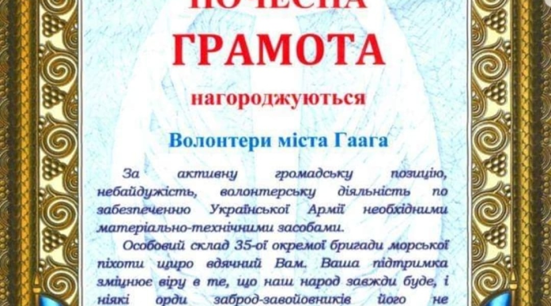“Це у мене відзнака президента України Петра Порошенка. Це для двох осіб. Це за гуманітарну участь в антитерористичній операції, і ось така медалька, дуже гарна, і для нашої голови фундації “Українці в Нідерландах”. А це є відзнака, яку ми отримали за п’ять років, за збір коштів, за купівлю позашляховиків, дефібриляторів…”, - каже жінка.