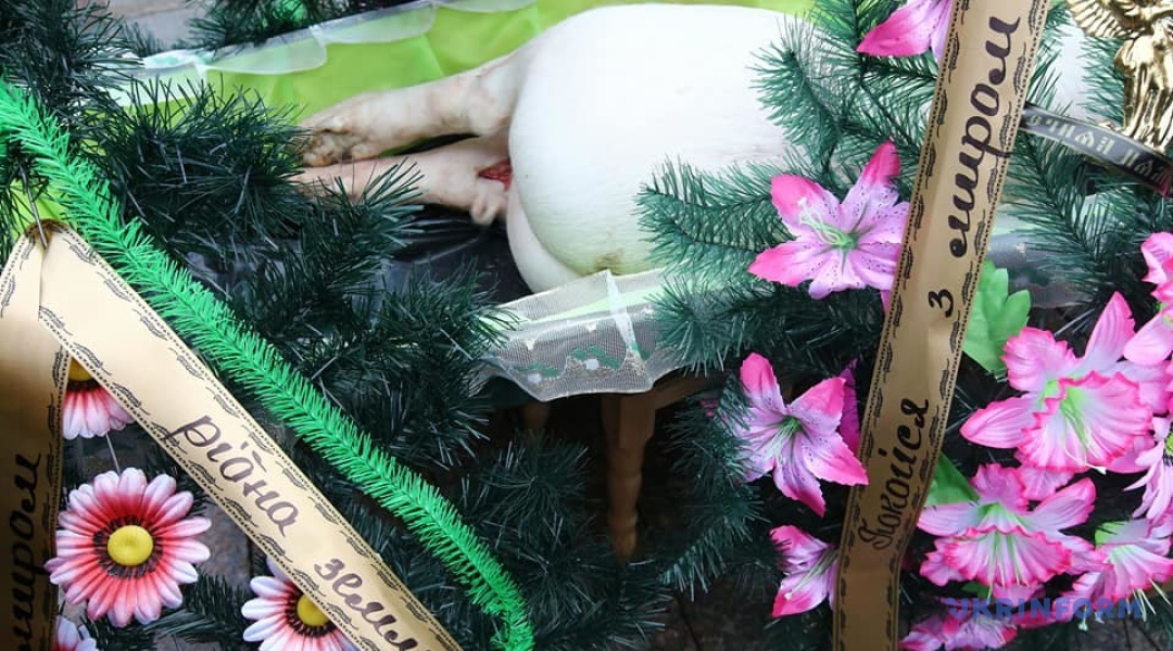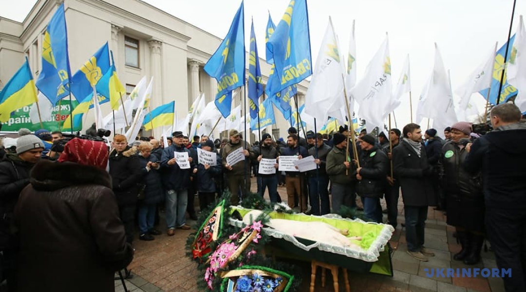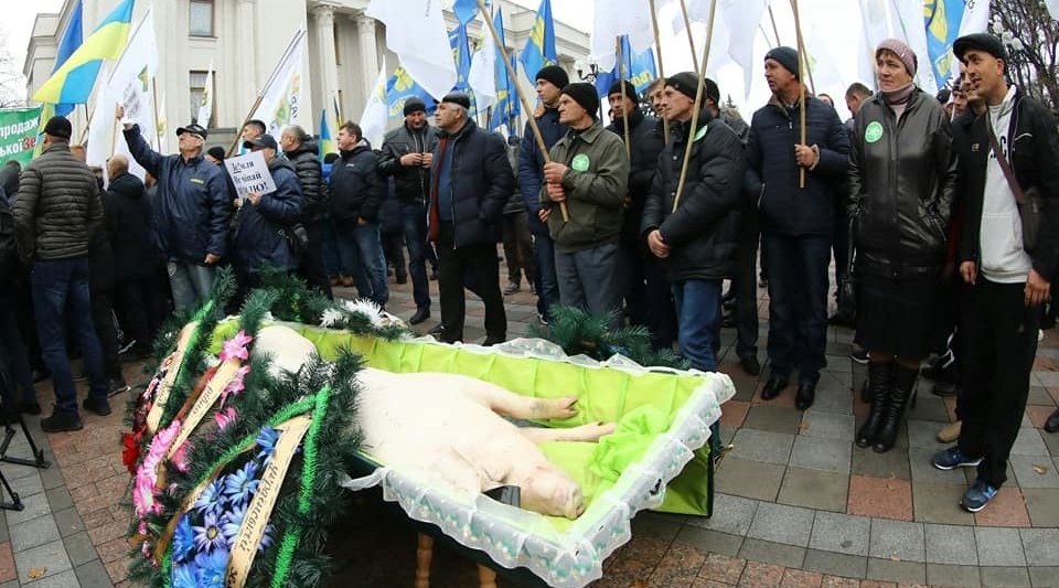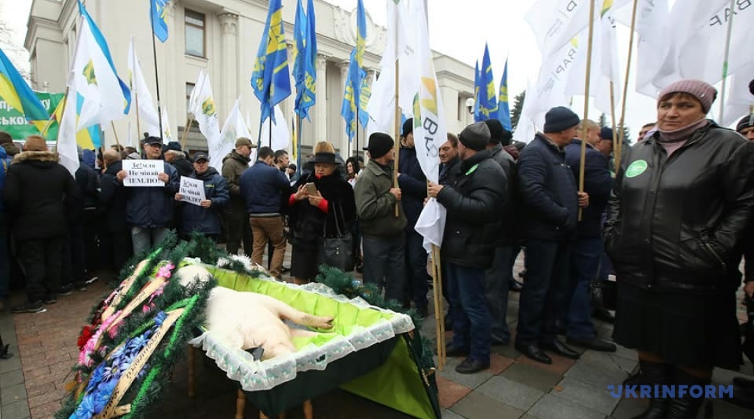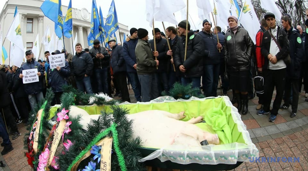 Під час акції протесту аграріїв проти продажу землі олігархам "Ні розпродажу України!", що відбувається під Верховною Радою проти прийняття законопроєкту про ринок землі №2178-10, "поховали" порося.