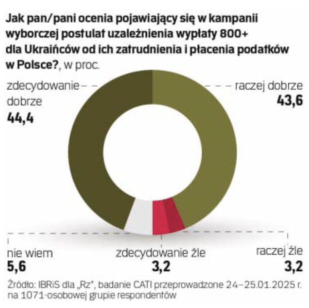 На запитання «Як ви оцінюєте твердження, що з’являється у виборчій кампанії в Польщі, про залежність виплати «800+» українцям від працевлаштування і сплати податків в Польщі?» 88% респондентів підтримали цю пропозицію. Натомість негативно її оцінили 3,2%, а 5,6% не визначилися з цього приводу.