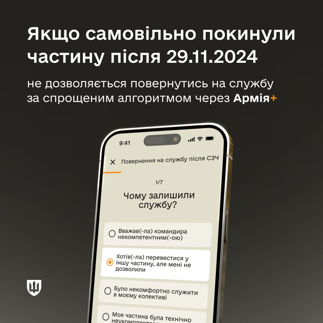 «Військовослужбовці, які вперше самовільно залишили військову частину, мають час до 1 березня 2025 року, щоб повернутися на службу без кримінальної відповідальності та перевестися в інший підрозділ. Проте цей спрощений алгоритм не стосується військових, які здійснили СЗЧ після 29 листопада 2024 року», - йдеться у повідомленні.