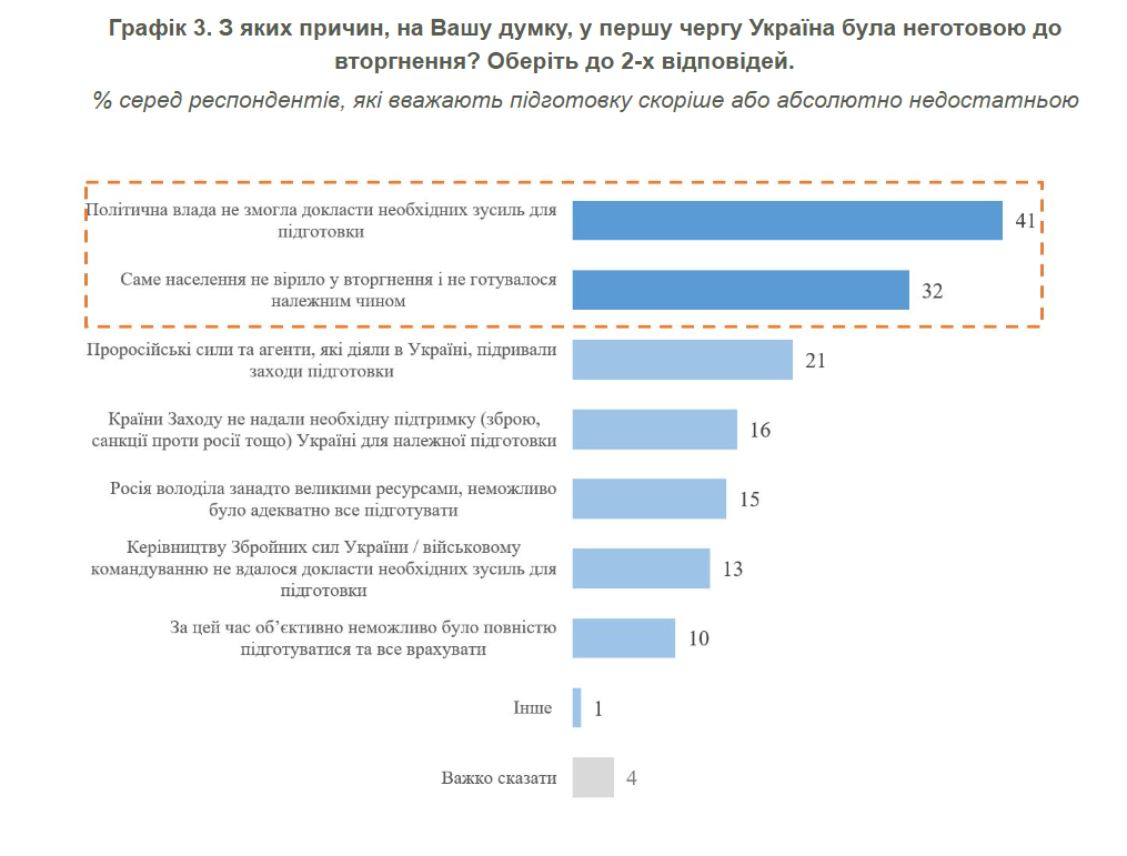 Результати опитування показують, що серед населення немає однозначного консенсусу і бачення причин недостатньої підготовки до вторгнення.