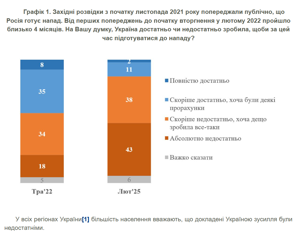 При цьому критичні оцінки навіть зросли – з 52% у травні 2022 року до 81% у лютому 2025 року стало більше тих, хто вважає докладені зусилля були недостатніми (з цих 81% вважають, що зусилля були абсолютно недостатніми – 43%, а решта 38% вважають, що зусилля були скоріше недостатніми, хоча визнають, що дещо було зроблене).
