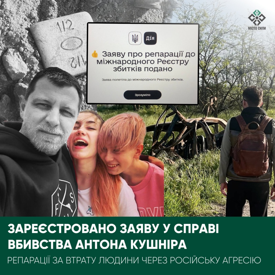 Вже у січні Світлана Медвєдєва і ГО «Місто сили» допомогли подати до Міжнародного Реєстру першу заяву про втрату близької людини. Стосувалася вона справи вбивства волонтера «Міста сили» Антона Кушніра. Росіяни вбили чоловіка 16 травня 2022 року на правобережжі Херсонщини, яке на той час було в окупації. Автівку 48-річного волонтера російські військові розстріляли під час евакуації ним людей з Херсона. У Антона залишилася велика родина, зокрема неповнолітні діти. Репарацій від Російської Федерації за непоправну втрату вимагає дружина вбитого Людмила Кушнір.