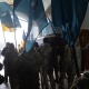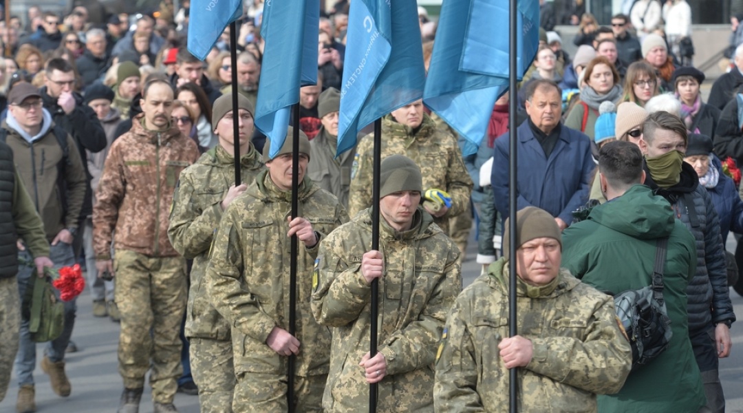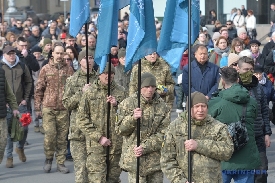 Люди тримали у руках жовто-сині і червоно-чорні прапори. Деякі військові мали прапори 414-ї окремої бригади безпілотних авіаційних систем «Птахи Мадяра», у якій служив Василь Ратушний.