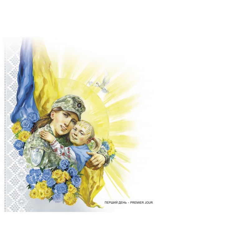 У центрі композиції - емоційна сцена обіймів жінки в традиційному українському вбранні та військового в камуфляжі. Жінка, яка символізує образ матері, загортає сина в яскраву жовту хустку з вишивкою, а її обличчя виражає глибокий смуток та ніжність.
