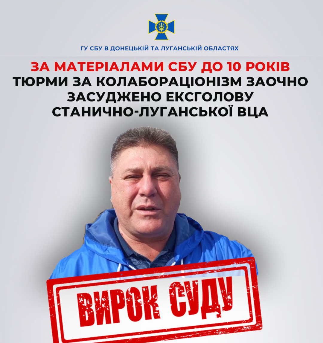 «До 10 років тюрми засуджено колишнього голову Станично-Луганської військово-цивільної адміністрації Альберта Зінченка. Чиновник з перших днів війни зрадив Україну та нині очолює незаконний орган влади, створений ворогом на Луганщині», - йдеться в повідомленні.