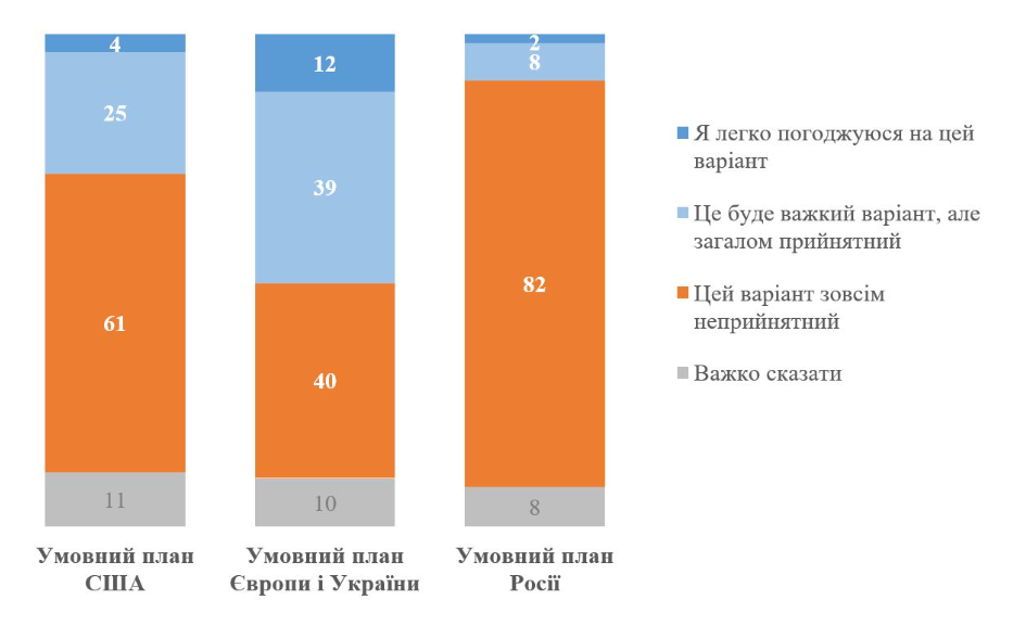 Водночас умовний план США можуть прийняти 29% респондентів (при цьому переважно опитані підкреслювати, що цей варіант є важким для них), але більшість – 61% – вважають його категорично неприйнятним.