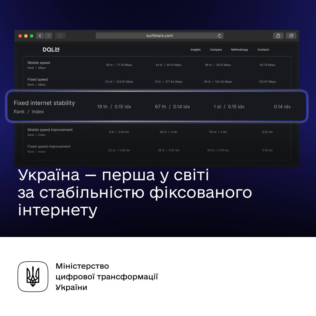 “Міжнародний рейтинг оцінює якість цифрових послуг у країнах, зокрема й інтернету. Україна посіла перше місце, завдяки розвитку xPON — технології, яка працює протягом 72 годин без світла і дає людям залишатися на звʼязку під час блекаутів”, - йдеться у повідомленні.