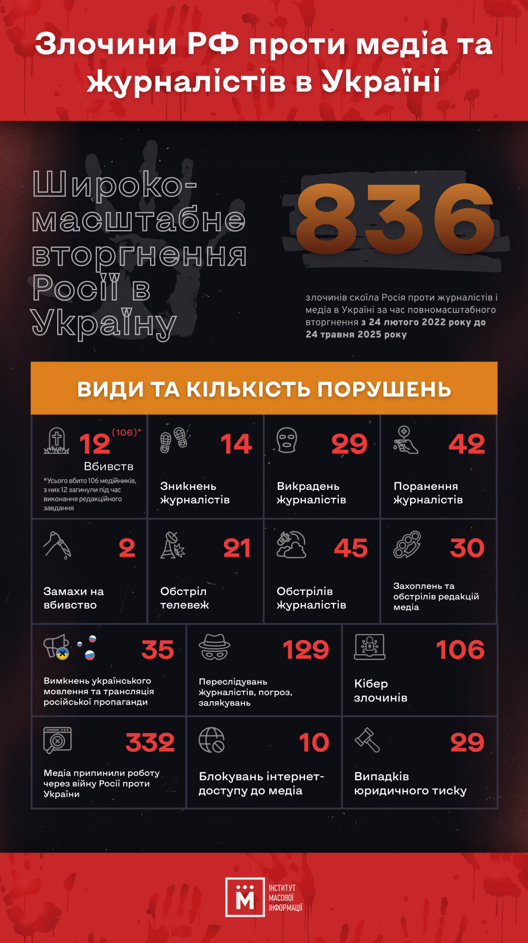 Загалом з початку повномасштабного вторгнення в Україну Росія вбила вже 106 медійників, з них 12 - під час виконання журналістської професійної діяльності.