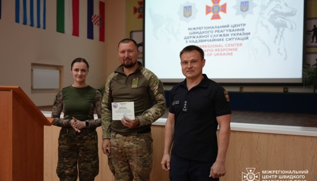 У Міжрегіональному центрі швидкого реагування Державної служби з надзвичайних ситуацій відбувся перший випуск фахівців мінно-пошукового напряму, які пройшли інтенсивні курси з розмінування територій із використанням службових собак.