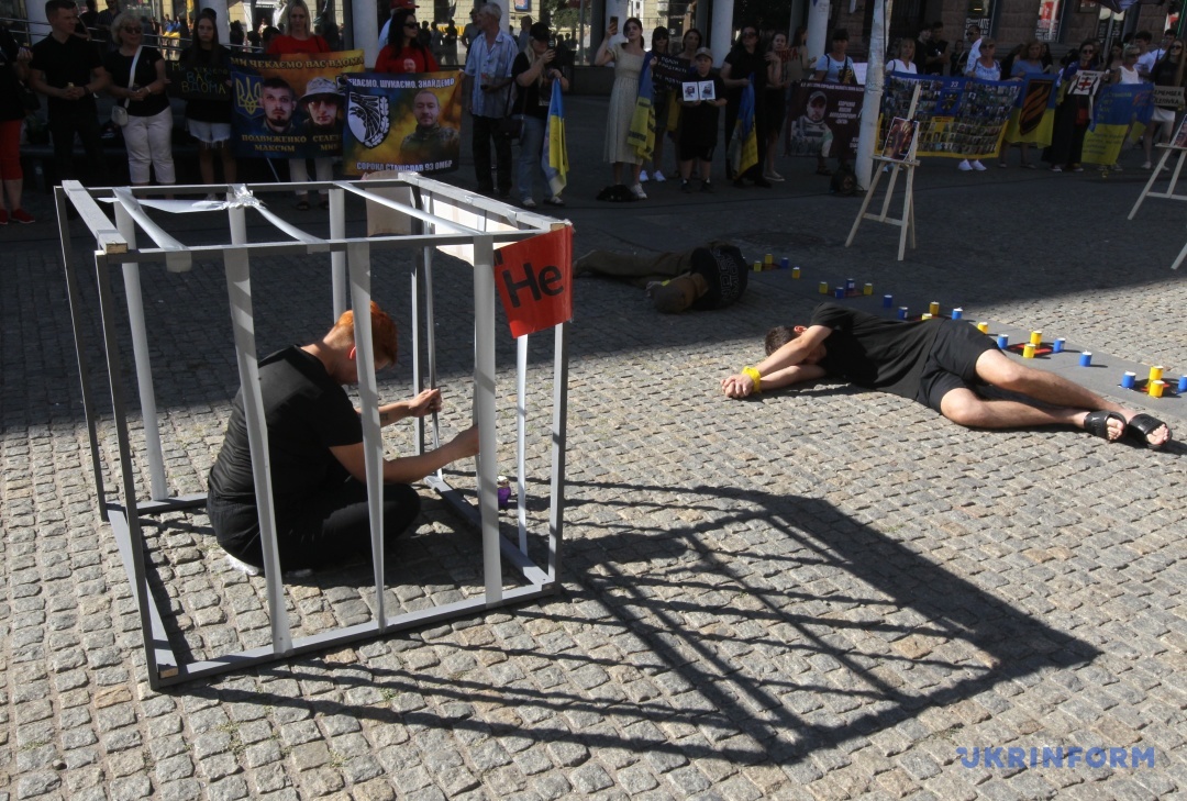 Учасники перформансу пам’яті, присвяченого третім роковинам російського теракту в колонії в Оленівці у ніч на 29 липня 2022 року, внаслідок якого загинули щонайменше 53 українські військові, у межах акції-нагадування про військовополонених та зниклих безвісти "Оленівка. Не маємо права забути" на Європейській площі, Дніпро, 2 серпня 2025 року.