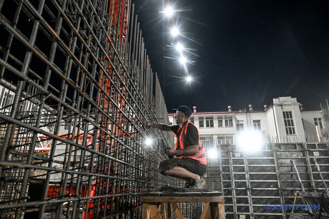 Робітник працює на будівництві нового хірургічного корпусу з протирадіаційним укриттям на базі Запорізької обласної клінічної дитячої лікарні, Запоріжжя, 7 серпня 2025 року.