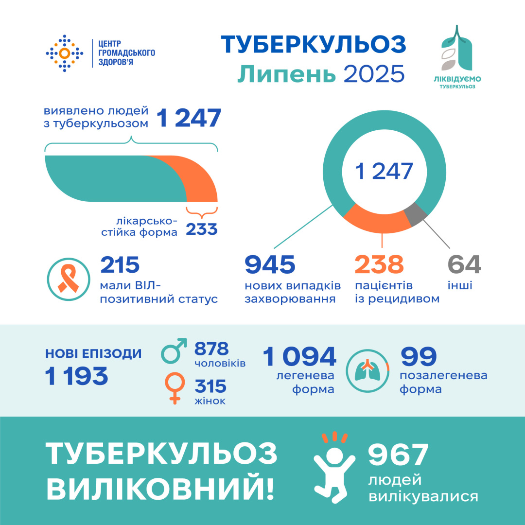 "У липні 2025 року в Україні зареєстровано 1247 людей з туберкульозом (ТБ): 945 нових випадків захворювання; 238 пацієнтів із рецидивом; 64 — інші (серед них: люди, які відновили лікування; пацієнти після невдалого курсу лікування; пацієнти з невідомою історією попереднього лікування)", - йдеться у повідомленні.