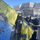 Присутні, тримають фотопортрети військовополонених, прапори України, стяги з назвами бойових підрозділів.