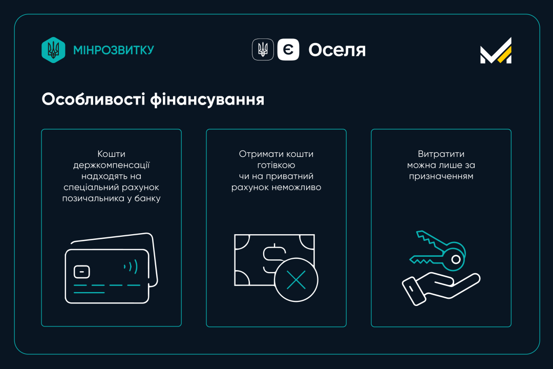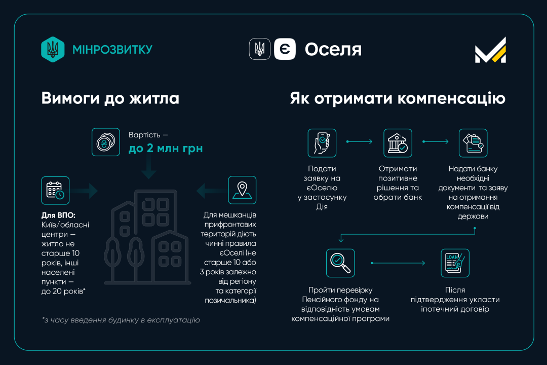 У міністерстві нагадали, що для отримання компенсації, необхідно подати заявку на участь у програмі «єОселя» через застосунок «Дія». Після отримання позитивного рішення потрібно обрати банк, у якому планується оформлення кредиту, якому необхідно надати пакет документів разом із заявою на отримання компенсації від держави.
