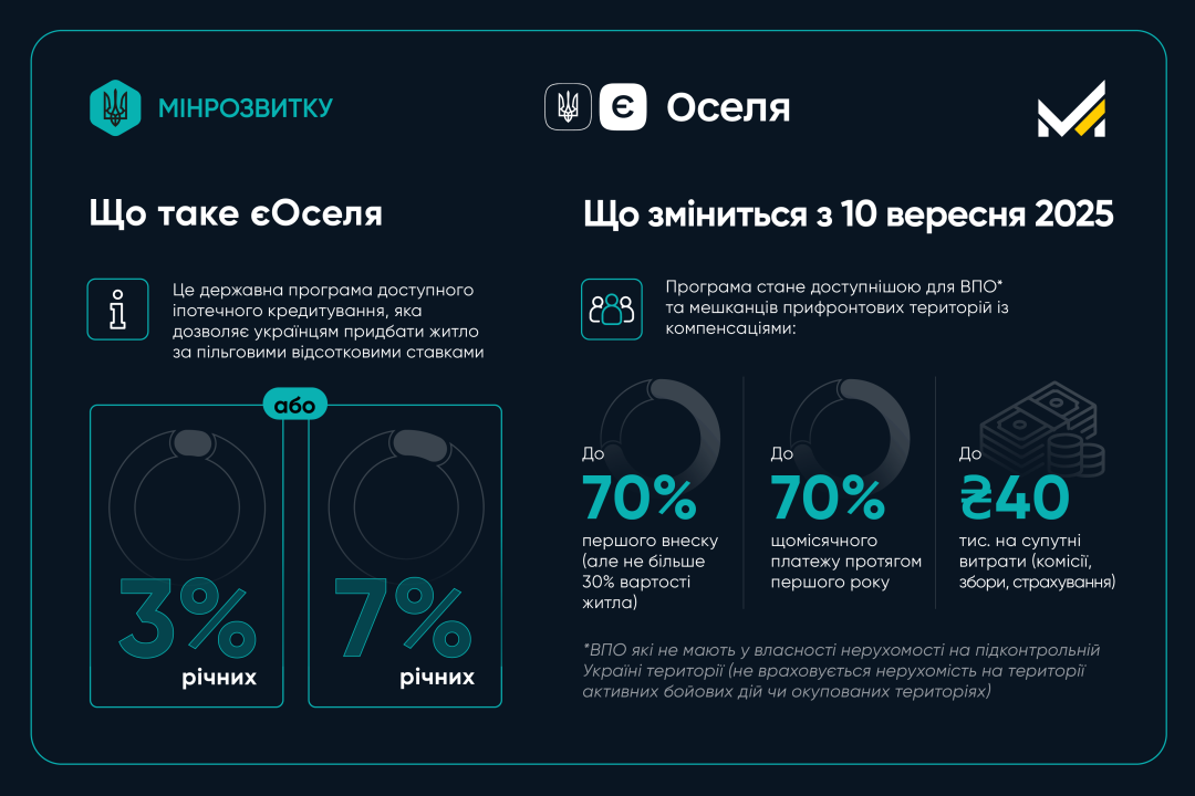 «З 10 вересня 2025 року в рамках комплексної програми підтримки прифронтових регіонів, запрацює оновлений механізм програми «єОселя». Йдеться про компенсації від держави для ВПО та мешканців прифронтових регіонів», - ідеться у повідомленні.