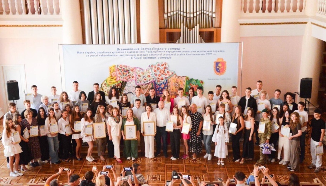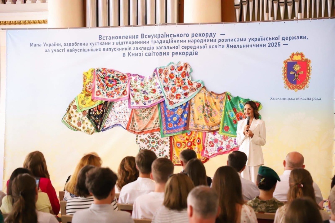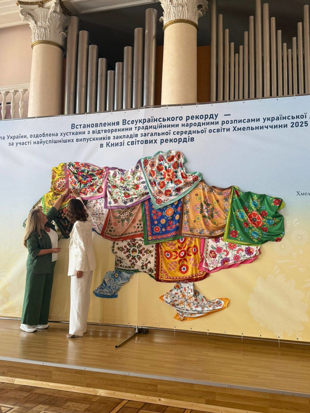 "21 серпня у місті Хмельницькому відбулося унікальне дійство - Книгою світових рекордів України було офіційно зафіксовано новий рекорд у категорії "Вперше". Найуспішніші випускники закладів загальної середньої освіти Хмельниччини створили мапу України розміром 3×5,9 м із драпірованих хусток, оздоблених автентичними народними розписами", - йдеться у повідомленні.
