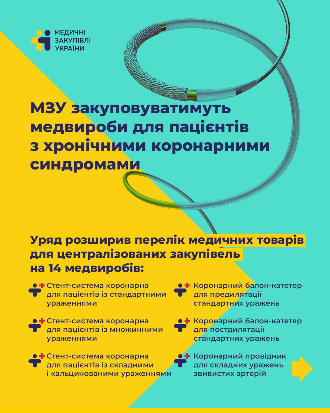 Як повідомлялося, уряд розширив перелік медичних товарів, що закуповуються централізовано за кошти держбюджету, новим піднапрямом. Він складається з 14 позицій медичних виробів, закупівля яких відбуватиметься в межах Програми медичних гарантій від НСЗУ, що дозволить пацієнтам отримувати оперативне лікування хронічних коронарних синдромів безоплатно.