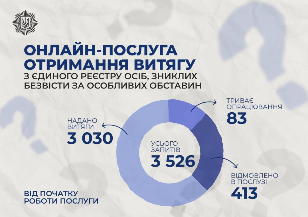 “Понад 3500 запитів на отримання витягу з Єдиного реєстру осіб, зниклих безвісти за особливих обставин, одержано з початку роботи онлайн-послуги. За результатами опрацювання надано 3030 витягів”, - зазначається в дописі.