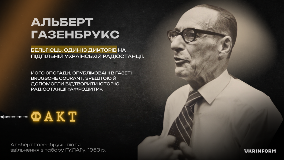 Історія «Афродіти» має ще не один дивовижний епізод. Але завжди згадують про диктора-іноземця на підпільній українській радіостанції, бельгійця Альберта Газенбрукса. Він вів передачі англійською та французькою мовами. Після знищення криївки, звіди мовила радіостанція, Альберт вижив, але його заарештували. 8 років відбув бельгієць у Сибіру у ГУЛАГУ, а після смерті Сталіна був повернений на батьківщину. Саме він лишив нам спогади про діяльність радіо Афродита.