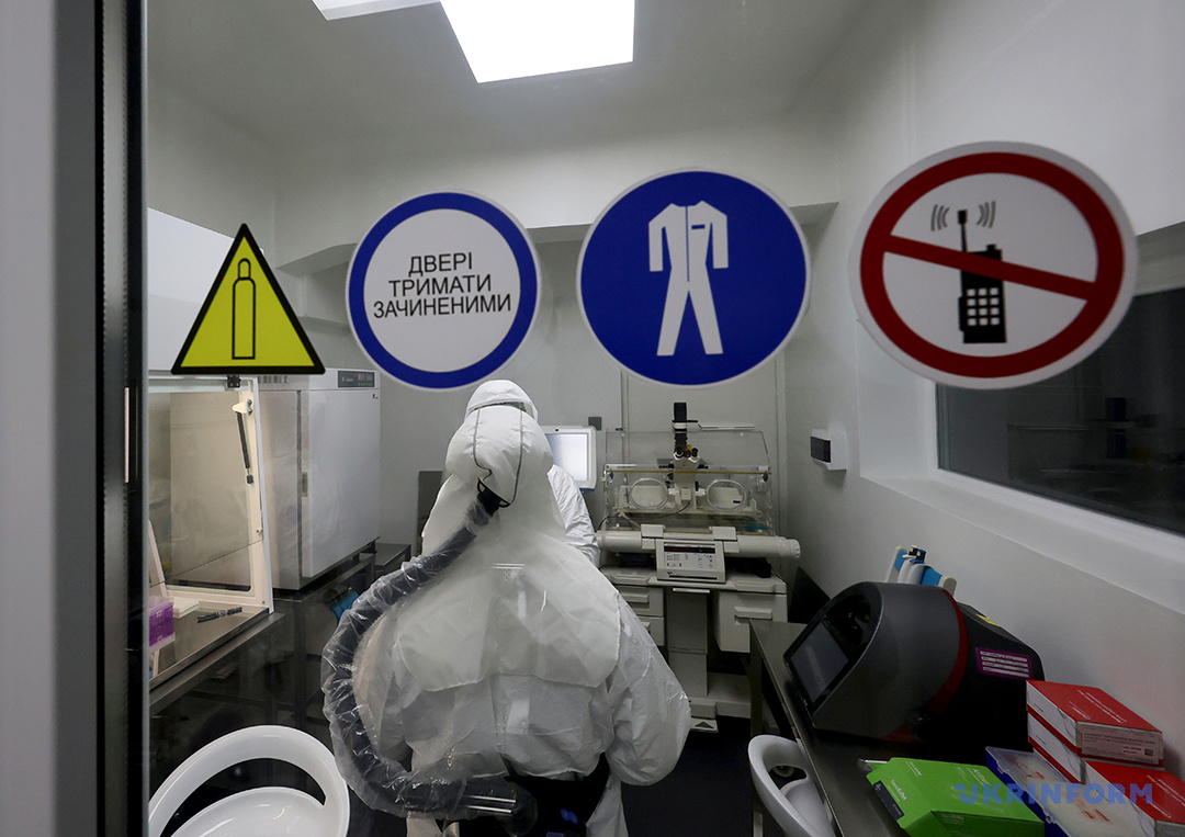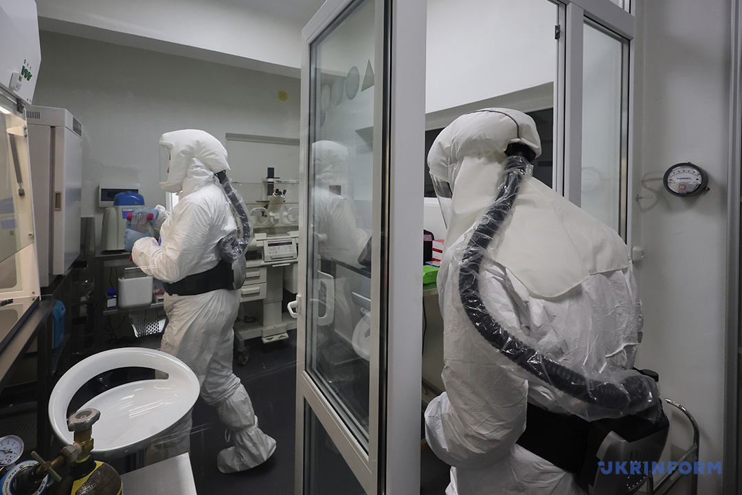 Процес починається у стерильному боксі для культивування клітин. Вхід – виключно у спеціальному костюмі. Всередині підтримується постійний позитивний тиск стерильного повітря (показник видно на манометрі), тому при відкриванні дверей неочищені повітряні маси з іншої частини лабораторії у приміщення не потрапляють.