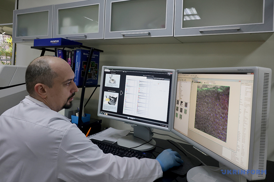 Готовий виріб перевіряють на конфокальному мікроскопі – приладі, який дозволяє дослідити структуру штучної тканини, розподілення та стан клітин у ній. Все керування – з моніторів. Роботу мікроскопа науковець пояснює так: