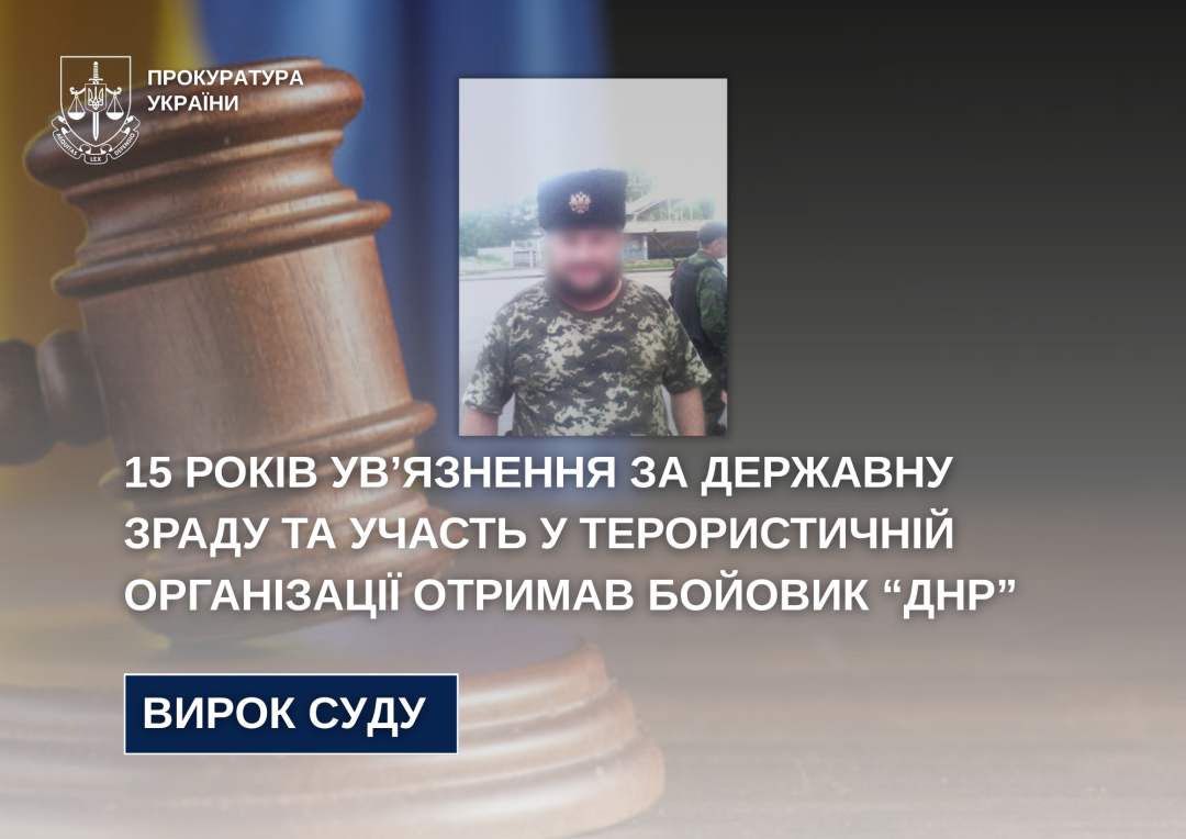 Як повідомляв Укрінформ, суд засудив до 15 років за ґратами жителя Донеччини, який воював на боці окупантів у складі псевдореспубліки “ДНР”.