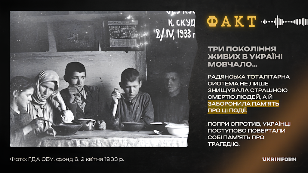 Варто нагадати, що радянська тоталітарна система не лише знищувала страшною смертю людей, а й забороняла пам’ять про ці події. Три покоління живих в Україні мовчали, а за згадку про голод 1933-го за радянського періоду можна було «загриміти» в тюрму. Та попри спротив, українці поступово повертали собі пам’ять про трагедію. І неймовірних зусиль до цього доклав американець індіанського походження, історик Джеймс Мейс.