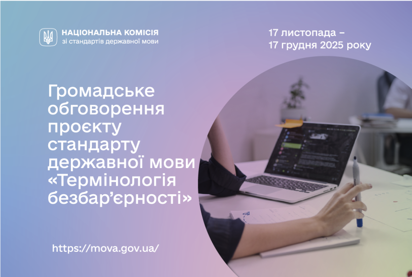 Національна комісія зі стандартів державної мови на засіданні схвалила І редакцію проєкту стандарту державної мови «Термінологія безбар’єрності» з редакційно-стилістичними уточненнями. Комісія відкриває документ для громадського обговорення, яке триватиме до 17 грудня 2025 року.