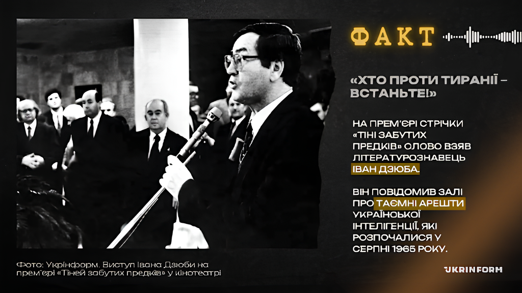 4 вересня 1965 року. Київ. Кінотеатр «Україна» (той самий, якого нині вже не існує, лишилось тільки приміщення) заповнений вщерть. Має відбутись довгоочікувана прем’єра фільму Сергія Параджанова «Тіні забутих предків». Стрічка вже мала чудову фестивальну історію і світове визнання, її вперше показують українській публіці. Атмосфера мала бути святковою, але у повітрі висіла тривога. Напередодні прем’єри Києвом прокотилася перша хвиля арештів українських митців: за ґратами опинилися Опанас Заливаха, Іван Світличний, Михайло Горинь, Михайло Масютко, Ярослава Менкуш.