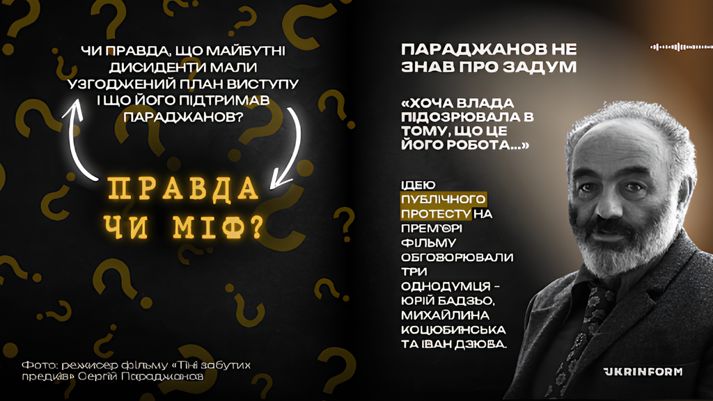 Іван Дзюба, один з ініціаторів акції, в інтерв’ю про С.Параджанова, даному Л.Брюховецькій, згадував, що режисер фільму «...не знав про наш задум. І ніхто не знав, крім трьох осіб (а сьогодні повно міфів довкола цього!); Юрія Бадзя, Михайлини Коцюбинської і мене. Чому? Ми втрьох радилися, що треба щось зробити, і як зробити, і хто має зробити – ну й вирішили, що я скажу на прем’єрі. Більше ніхто не знав і не повинен був знати, інакше воно б зірвалось. І Сергій не знав, хоча влада підозрювала в тому, що це його робота. І я, коли йшов на це, дуже переживав – розумів, що це буде удар для нього, але вирішив: це справа настільки важлива, що промовчати про ці репресії – гріх. І подумав, що Сергій простить. Але він не тільки простив, а був страшенно радий, захоплений, щасливий, що ця акція відбулася на його прем’єрі».