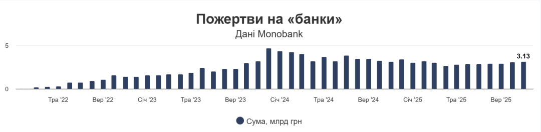 Аналітики зауважують, що за останній рік на 19% скоротилися пожертви на відкриті у mono «банки». Наразі в середньому щомісяця українці донатять 2,95 млрд грн. За 11 місяців поточного року люди закинули на збори 32,47 млрд грн.