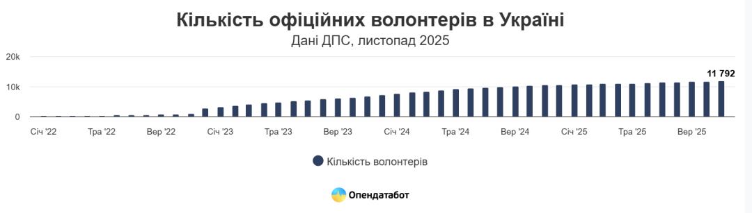 «11 792 волонтери станом на початок грудня зареєстровано у відповідному реєстрі ДПС. Офіційних волонтерів в країні менше не стало, хоча поповнюється цей перелік не так активно, як раніше — лише на 11% за рік <…> Водночас від початку року з волонтерського переліку виключили 136 людей», - йдеться в повідомленні.