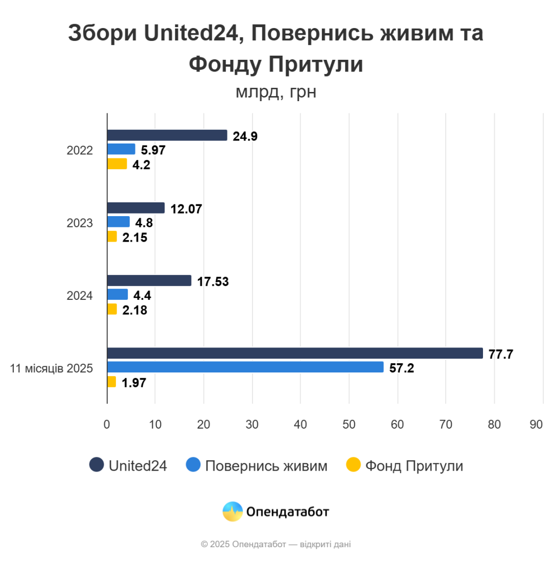 Так, три найбільші фонди України - United24, «Повернись живим» та «Фонд Притули» – зібрали з початку року 105,87 млрд грн пожертв, на 37% більше, ніж за три попередні роки разом.