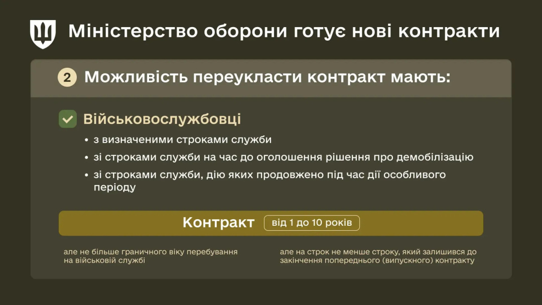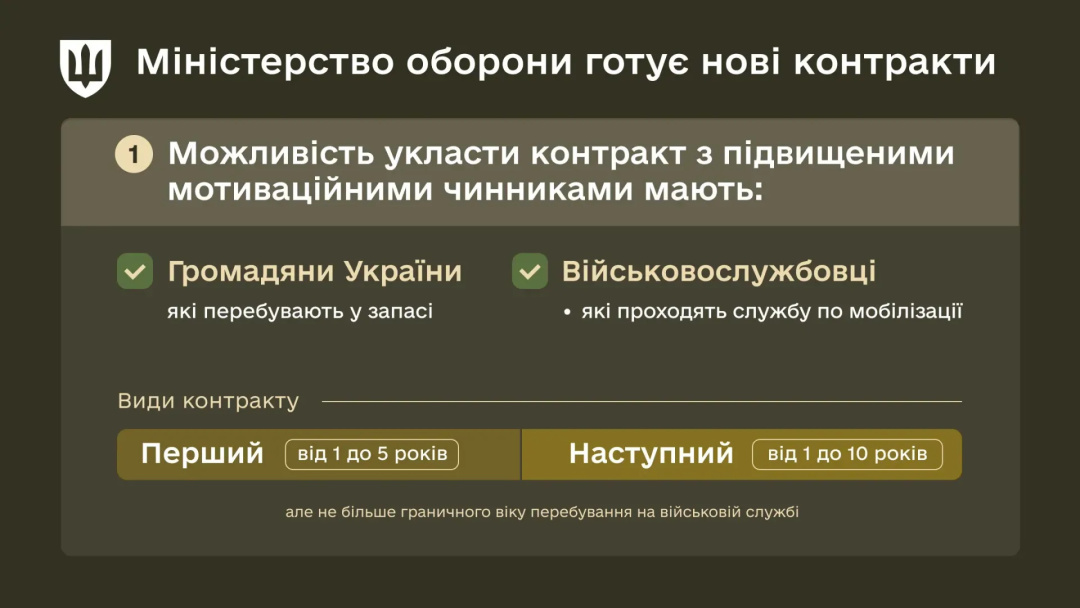 Законопроєкт передбачає більш гнучкі строки контрактів під час особливого періоду. Перший контракт з підвищеними мотиваційними чинниками укладатиметься на термін від 1 до 5 років. Наступні контракти - від 1 до 10 років (але не більше граничного віку перебування на військовій службі).