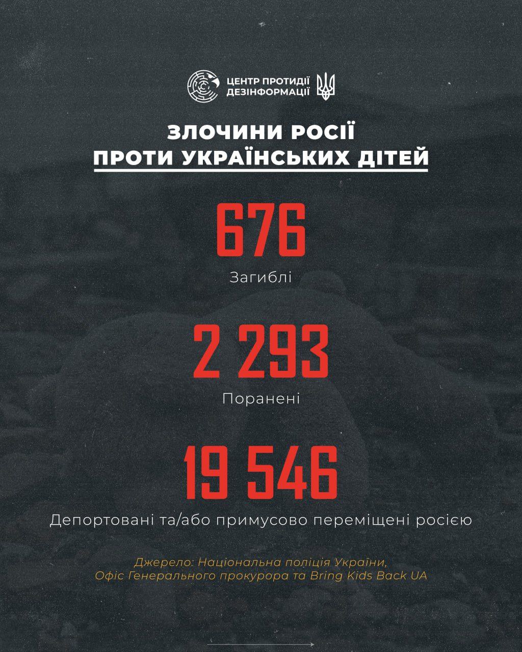 Згідно з оприлюдненою на сайті ОГП інфографікою, у період повномасштабного вторгнення РФ в Україні загинуло 676 дітей, поранень зазнали 2293 дитини.