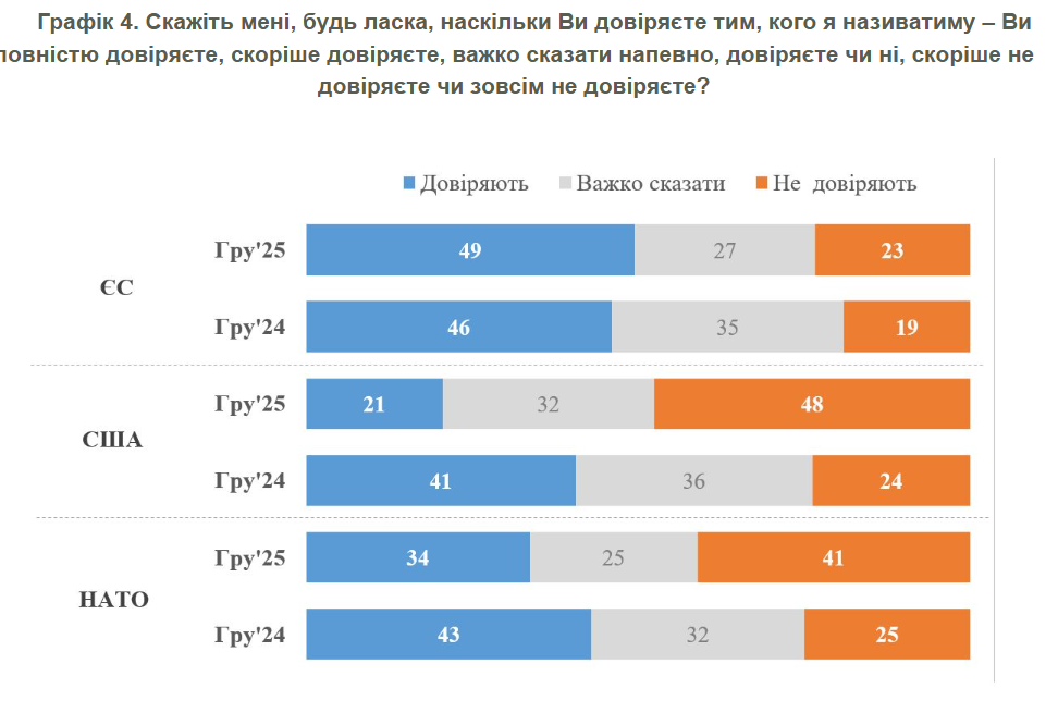 У випадку НАТО 34% довіряють організації (зниження з 43% у грудні 2024 року), а 41% не довіряють (ріст з 25%).