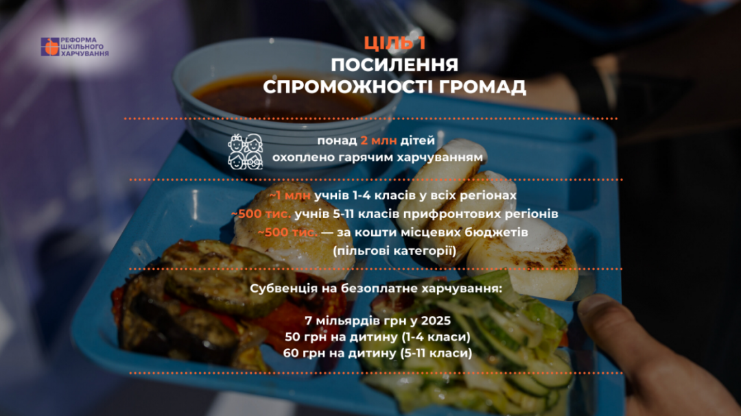 За словами дружини Президента, один із ключових результатів цього року – розширення програми безоплатного гарячого харчування. З 1 вересня його отримують учні не лише початкових класів по всій Україні, а й 5–11 класів у прифронтових і прикордонних регіонах – на Дніпровщині, Донеччині, Запоріжжі, Миколаївщині, Одещині, Сумщині, Харківщині, Херсонщині та Чернігівщині. Для цього у 2025 році держава спрямувала до місцевих бюджетів понад 7 млрд грн субвенції.