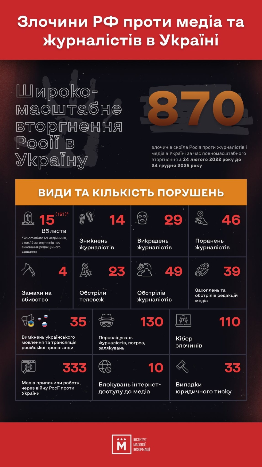Серед основних російських злочинів проти журналістів і медіа: вбивства журналістів (121), зникнення (14), викрадення (29), обстріли (49), поранення (46), замахи на вбивство (4), переслідування, погрози і залякування журналістів (130), захоплення та обстріл редакцій (39), обстріли телевеж (23), вимкнення українського мовлення і запуски на базі українських медіа російської пропаганди (35), кіберзлочини (110), закриття медіа, спричинене повномасштабною російською агресією (333), блокування інтернет-доступу до медіа (10), юридичний тиск (33).