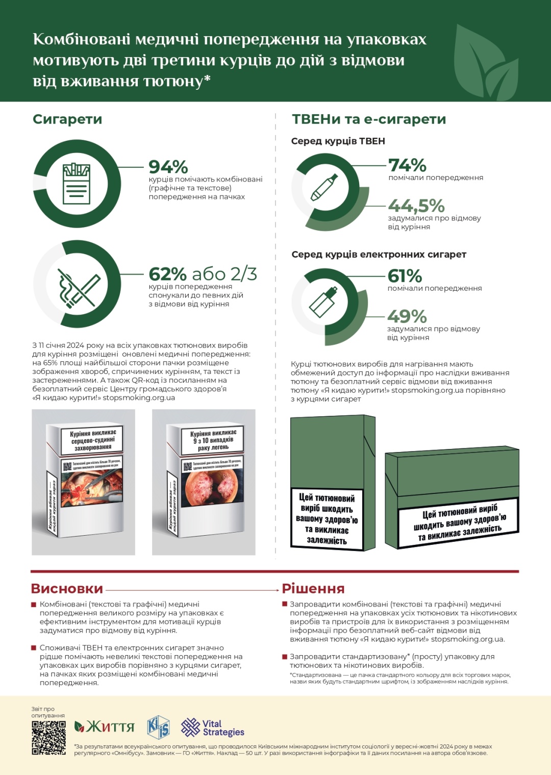 З 11 січня 2024 року на всіх упаковках тютюнових виробів для куріння розміщуються оновлені комбіновані медичні попередження: зображення хвороб, що спричинені вживанням тютюну та нікотину, і текстові застереження займають 65% найбільшої площі пачки, а також містять QR-код із посиланням на безоплатний національний сервіс відмови від вживання тютюну stopsmoking.org.ua.