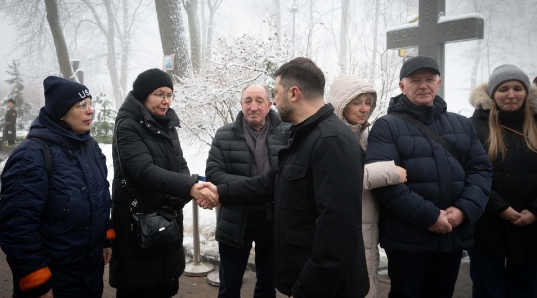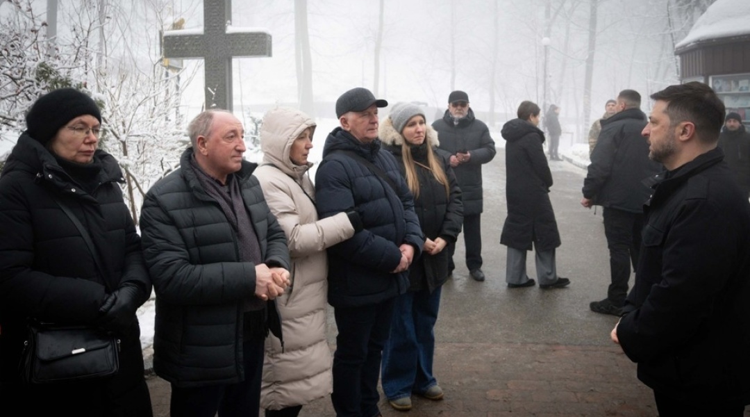 Як повідомляється на сайті Президента України, поблизу церкви Святого Миколая Зеленський поспілкувався з рідними загиблих захисників, похованих на Аскольдовій могилі: Лілією Авер’яновою (мама Андрія Пільщикова), Мариною Соченко (мама Любомира Соченка) та Мариною, Людмилою і Віктором Петриченками (сестрою і батьками Павла Петриченка).