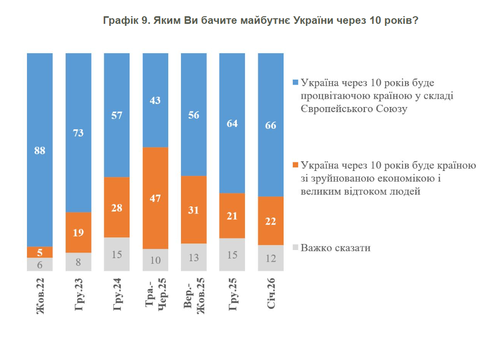 Попри складну зиму і терористичні дії Росії станом на кінець січня 2026 року 66% респондентів були оптимістами і вважали, що через 10 років Україна буде процвітаючою країною-членом Євросоюзу.