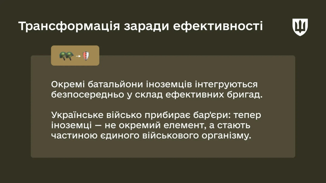 У Міноборони підкреслили, що переважна частина легіонерів тепер інтегрується до лінійних бригад, отримуючи кращу зброю, захист та доступ до важкої техніки, а вузькопрофільні фахівці працюватимуть за фахом у профільних ротах.
