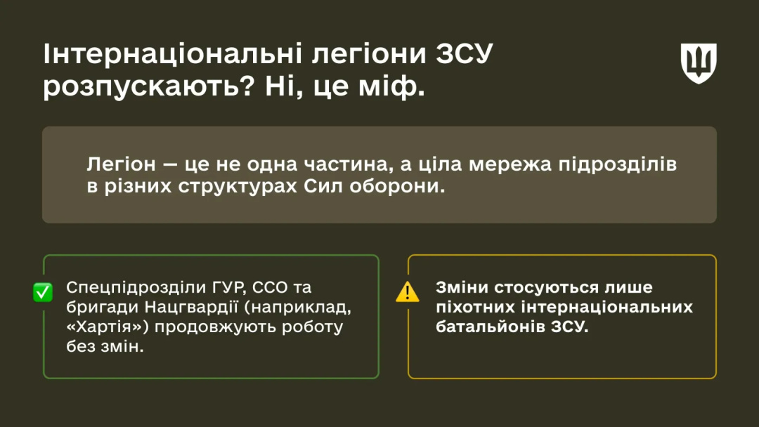 «Ні, це неправда. Інтернаціональні легіони не зникають. Вони трансформуються, щоб стати сильнішими», - наголосили у МОУ.