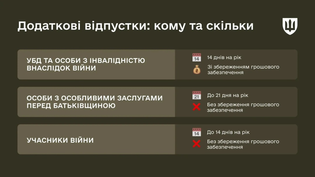 Учасники війни мають право до 2 тижнів додаткової відпустки на рік. Така відпустка також надається без збереження грошового забезпечення.