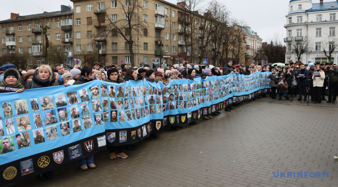 Учасники маршу пройшли від Європейського парламенту до будівлі представництва ЄС, навпроти якого розгорнули гігантський банер з фотографіями та іменами українських військових, які перебувають у полоні.